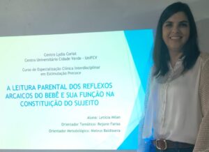 A leitura parental dos reflexos arcaicos do bebê como função na constituição do sujeito é recebido no nascimento é o título do seu Trabalho de Conclusão, apresentado no segundo semestre/2025 para o Curso de Especialização Latu Sensu Clínica Interdisciplinar em Estimulação Precoce. Centro Lydia Coriat – UniFCV Centro Universitário Cidade Verde.